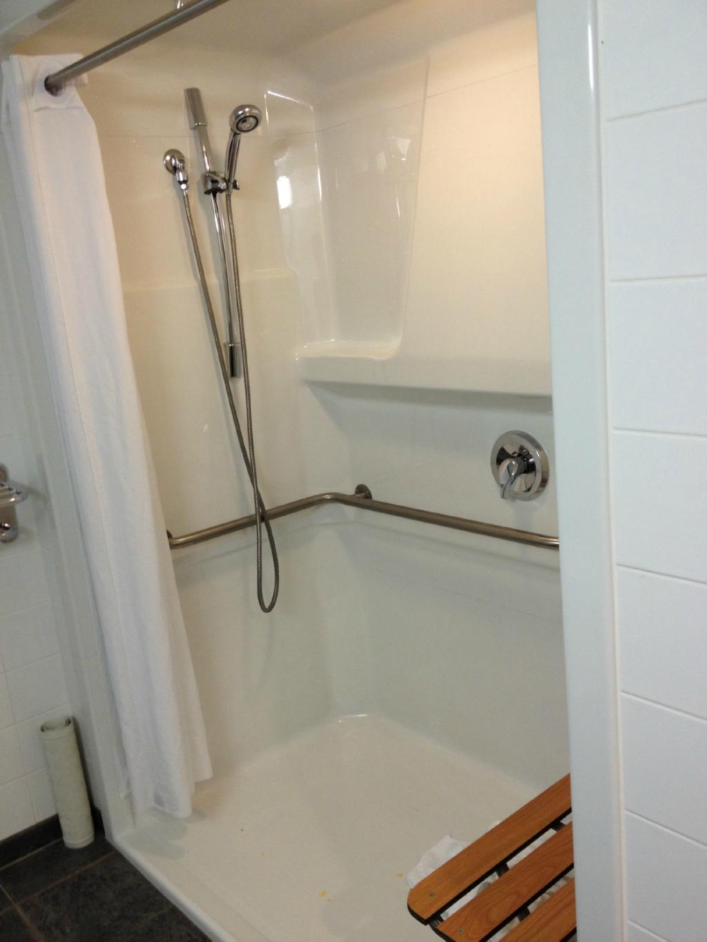 The bathroom was equipped with a wheel-under sink and a wheel-in shower with a built-in shower bench.
