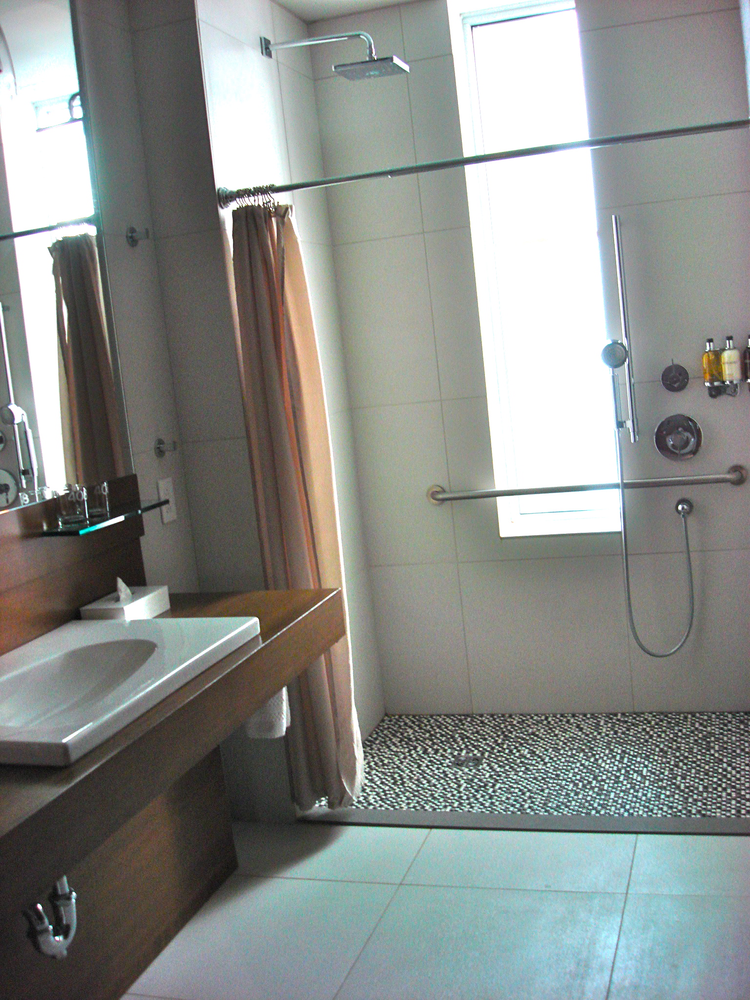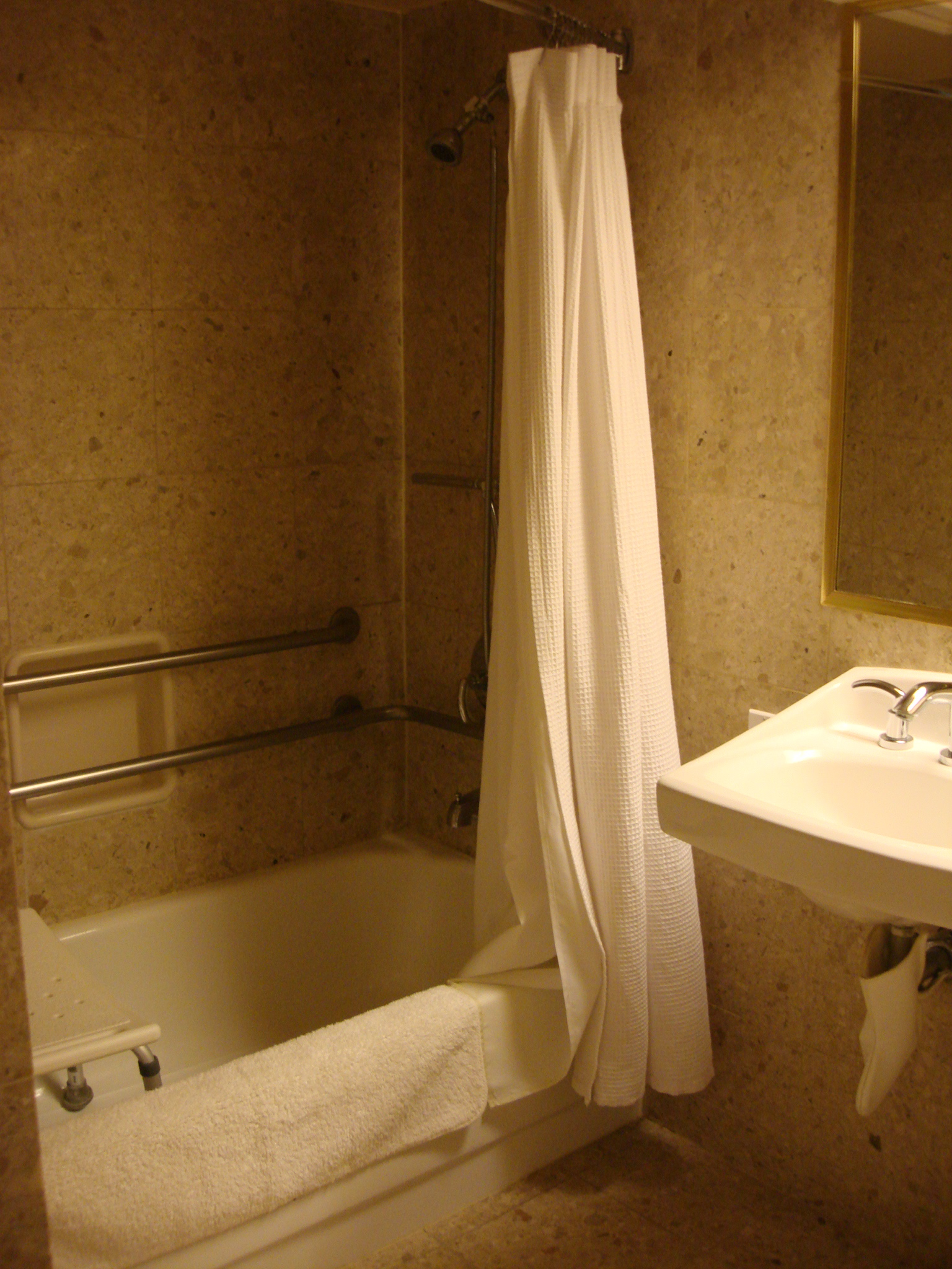 The bathroom in our room was huge and had a toilet with grab bars, wheel-under sink and wheel-in shower. The fixed shower head was a cool rain-shower type shower head but a wheelchair user would likely need to use the handheld shower head closer to the controls.