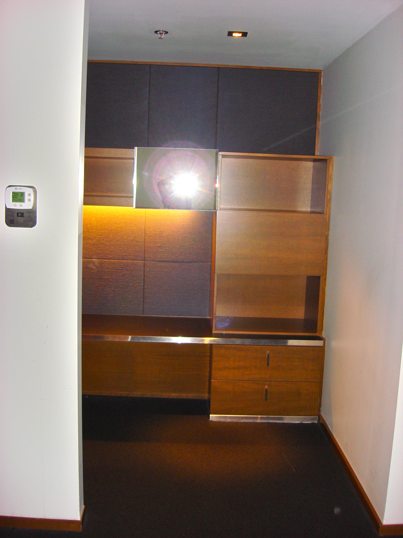 At the entry of the hotel room, there is a huge walk-in closet area. The rods are lower and within easy reach for someone in a wheelchair. Given that we were here for a wedding, it was really nice to have a lot of room for hanging up our dressy clothes and a lot of space to get ready in.
