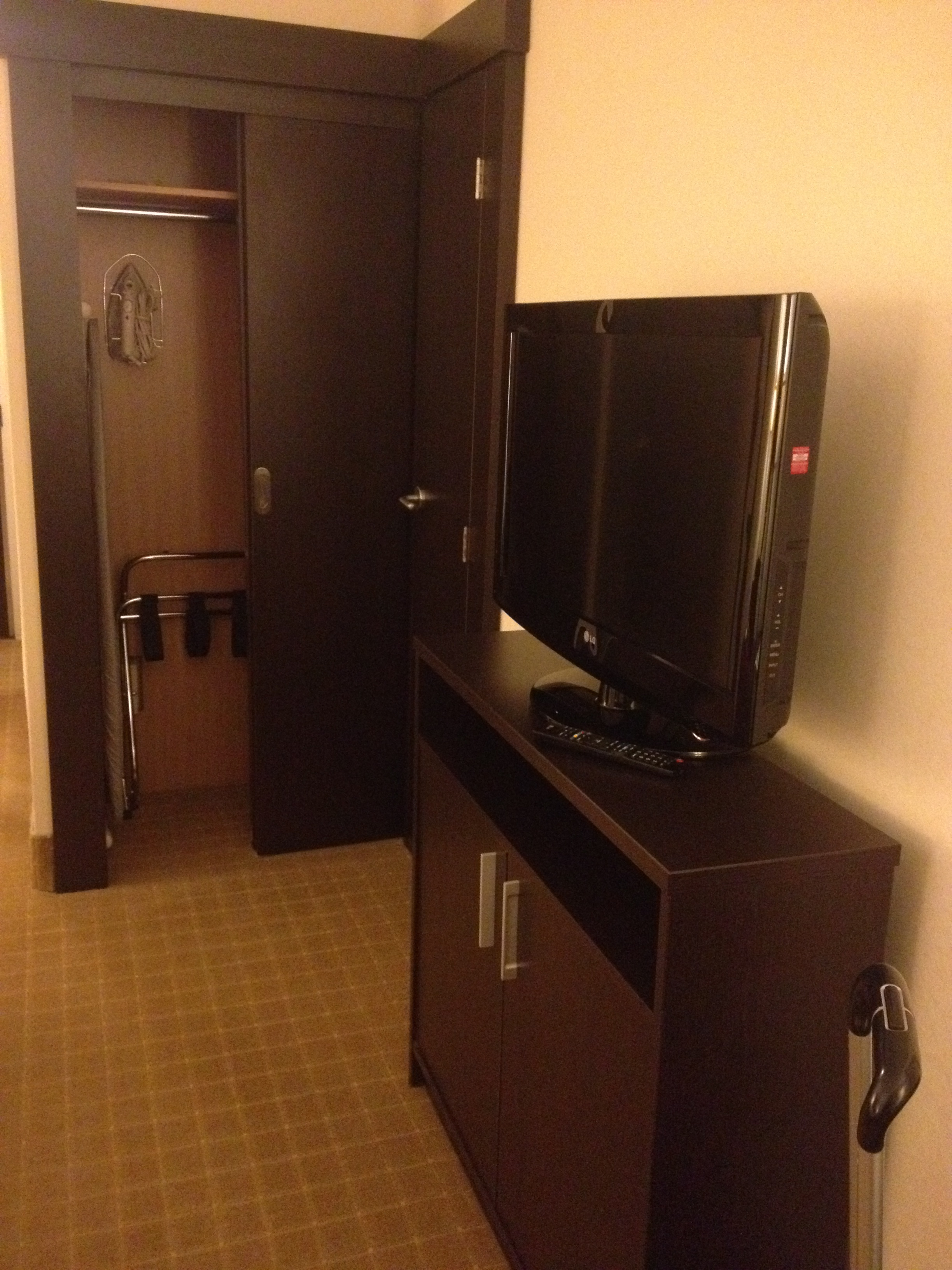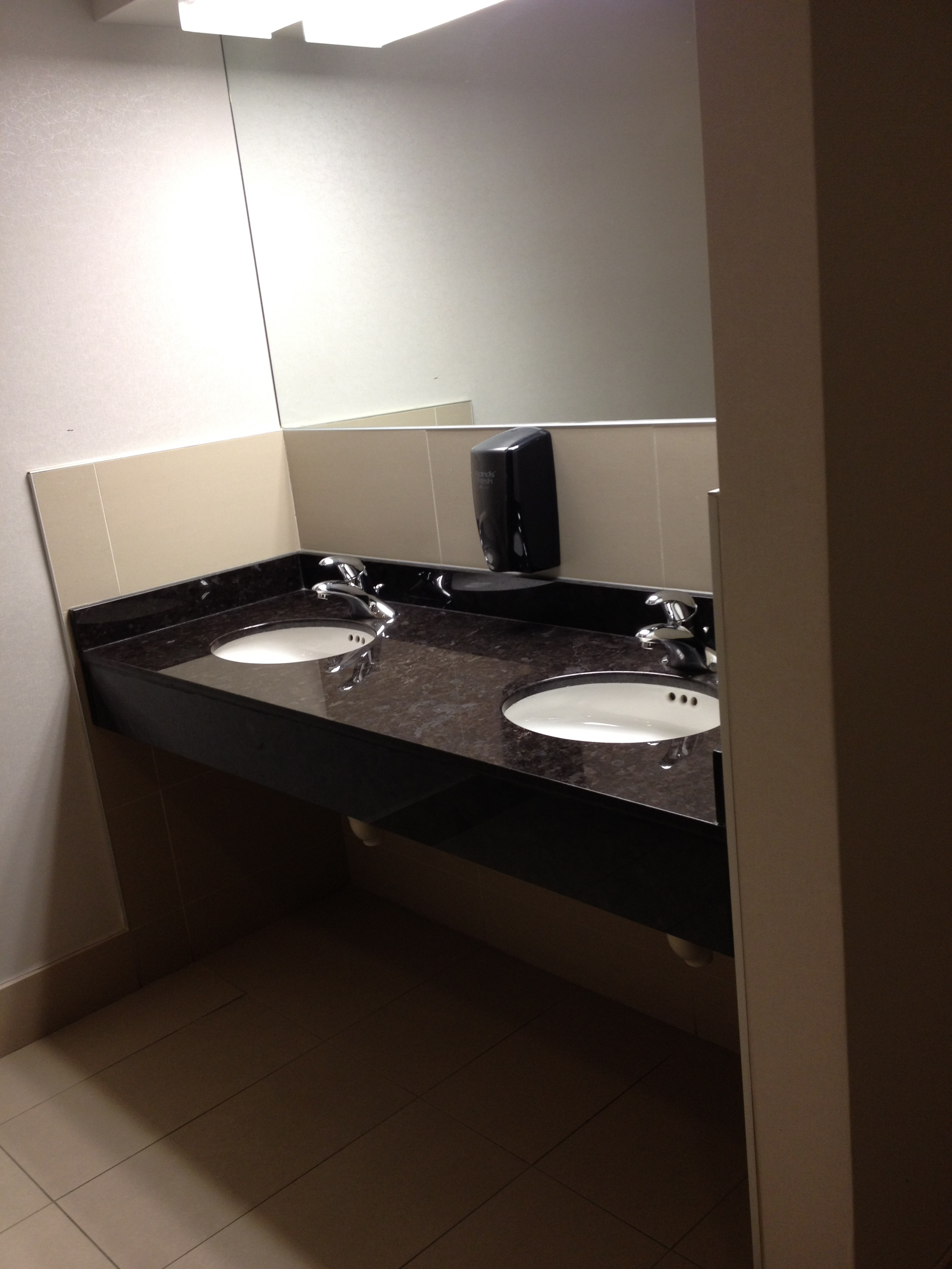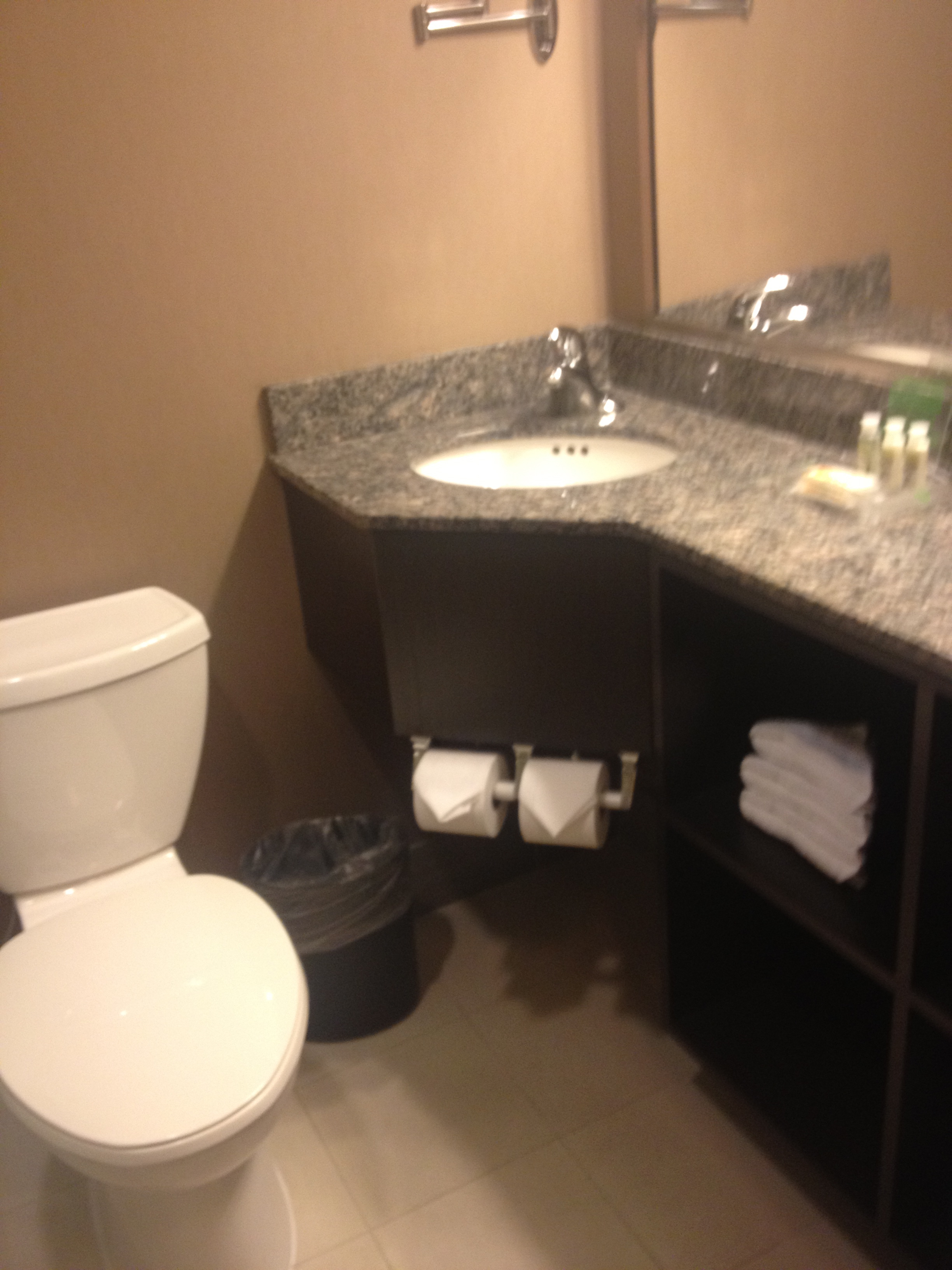 The sink was outside in the main area of the room, which was nice as it could be used even if someone was in the bathroom. It was small but it was wheel-under. The height of the counter was good for those in wheelchairs (although basin-type sinks can be trickier to use when you can’t stand over them).