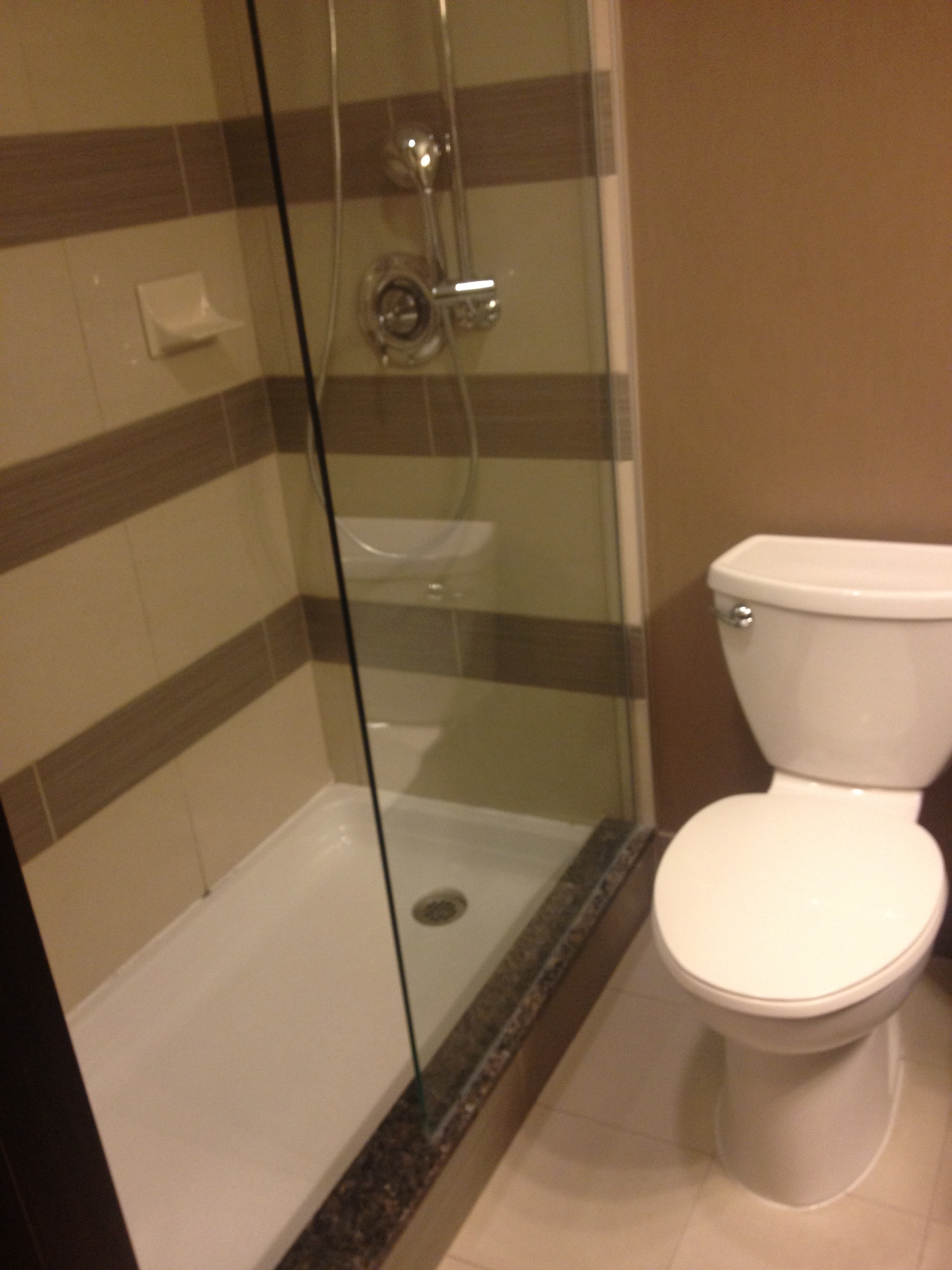 The bathroom in our room was very compact (as all of them are on the boat) but it had everything we needed. The shower and toilet were in a separate room of their own. The toilet came equipped with grab bars on all sides of the toilet (and behind) and a plastic, raised toilet seat. The shower was small but functional and had a built-in shower bench that folded up and out of the way when not in use. The shower controls could easily be accessed by someone sitting on the shower bench.